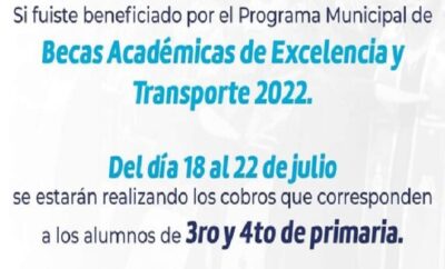 Redacción | 24 julio, 2022Alumnos de 3° y 4° tienen hasta el 29 de julio para cobrar su Beca de Excelencia o Transporte