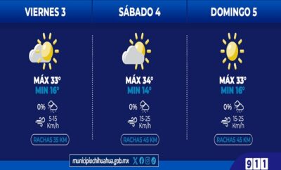 Ciudad de Chihuahua.- Del 3 al 5 de mayo, se prevén temperaturas máximas de 34°C y mínimas de...