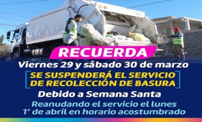 Redacción | 28 marzo, 2024Suspenderán servicio de recolección de basura viernes 29 y sábado 30 de marzo