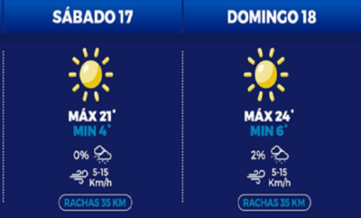 Redacción | 17 febrero, 2024Máximas de 24°C y mínimas de 4°C para este fin de semana