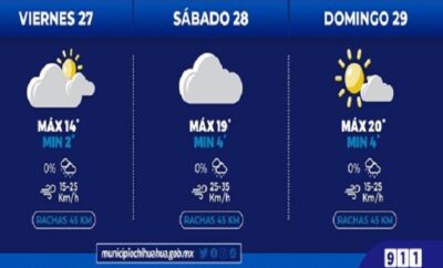 Redacción | 27 enero, 2023Pronostican mínimas de 2°C para este fin de semana en Chihuahua Capital