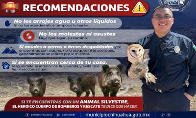 Ciudad de Chihuahua.- El Heroico Cuerpo de Bomberos emite recomendaciones para prevenir incidentes relacionados con animales silvestres. “Debido...
