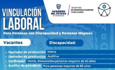 Chihuahua.- La Secretaría de Desarrollo Humano y Bien Común (SDHyBC), dio a conocer las vacantes disponibles para personas...