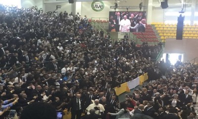 Las consignas de bienvenida al Papa Francisco en el gimnasio del COBACH fueron emotivas para él y los...