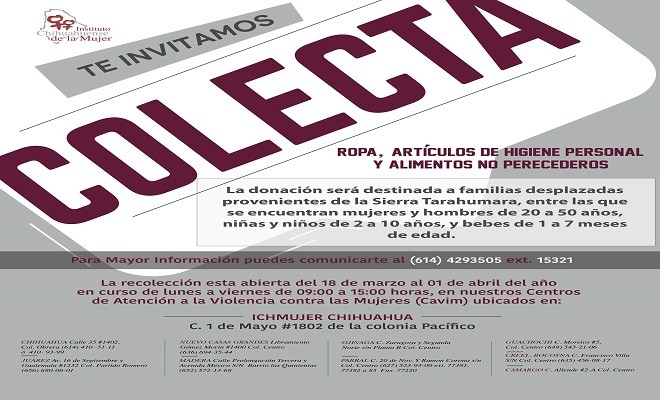 El Instituto Chihuahuense de la Mujer(Ichmujer) continuará hasta el próximo viernes 01 de abril del año en curso con la recepción de donaciones para familias desplazadas provenientes de la Sierra Tarahumara.
