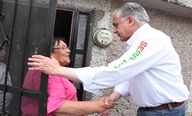 Parral, Chih.- Cientos de vecinos acompañaron al candidato a la gubernatura Enrique Serrano en un recorrido por las calles de la colonia PRI en la ciudad de Parral, sector en el que saludó mano a mano a las personas que se encontraban en sus domicilios.
