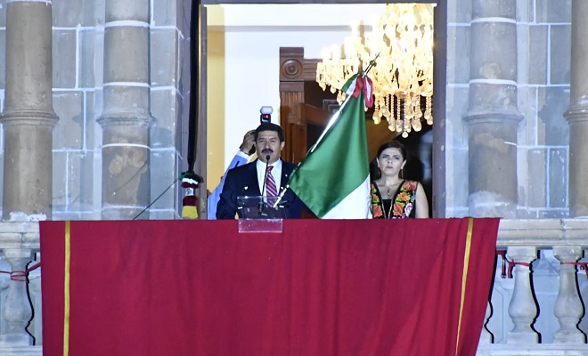Posteriormente el titular del Ejecutivo y la comitiva, subieron al primer piso de Palacio de Gobierno para dirigirse al salón Miguel Hidalgo, donde de manos de la escolta recibió la enseña Patria, para después salir al balcón en punto de las 11:00 horas y ante la algarabía de la multitud emitir el tradicional Grito.
