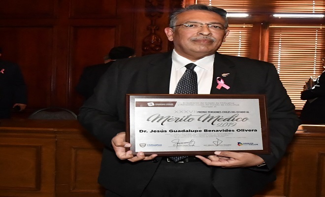 El Dr. José Guadalupe Benavides Olivera fue galardonado con el XXXVII Premio al Mérito Médico edición 2019 de Pensiones Civiles del Estado (PCE), de manos del secretario de Salud, Jesús Enrique Grajeda Herrera, en representación del gobernador Javier Corral Jurado.