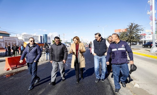 la alcaldesa Maru Campos Galván llevó a cabo la supervisión de los trabajos de recarpeteo en la avenida Tecnológico, donde personal de la Dirección de Obras Públicas rehabilita un tramo de 1.5 kilómetros de esta transitada vialidad.