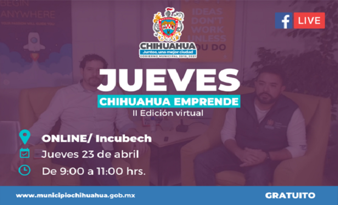 Con el fin de seguir trabajando para la ciudadanía durante la contingencia del COVID 19, este jueves 23 de abril se realizará la segunda edición del “Jueves Chihuahua Emprende” en su modalidad virtual, para brindar herramientas a emprendedores y micro, pequeños y medianos empresarios.