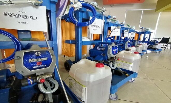 La entrega se realizó la mañana del miércoles a los mandos policiales y de bomberos en las instalaciones del centro deportivo Cedipol e incluye una maquina pulverizadora de aspersión, un carrito para facilitar la movilidad, químicos sanitizantes, gel, aspersores, caretas, guantes y otros productos, todo lo necesario para realizar de manera fácil y rápida la desinfección de los vehículos, eficientando con ello los tiempos de atención ciudadana.