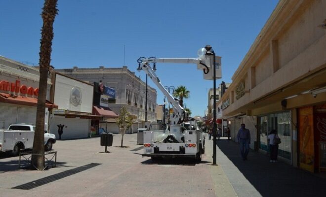 Chihuahua.- La Dirección de Mantenimiento Urbano Municipal, llevó a cabo acciones de restitución de cableado en la calle Libertad uno de los corredores más importantes de la zona centro, además de colocar luminarias a lo largo de la mencionada calle peatonal.