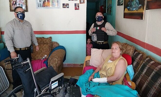 Elementos de la Dirección de Seguridad Pública adscritos a los grupos de Atención a Pandillas y Escolar se dieron a la tarea de solicitar ante el DIF Municipal ayuda en especie para 10 familias que no contaban con lo básico para alimentarse, además de una silla de ruedas que lograron adquirir para una mujer de 58 años de la colonia Villa Juárez que había sufrido una caída y requería de este aparato.