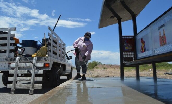 Chihuahua.-La Dirección de Mantenimiento Urbano Municipal realiza de forma diaria y permanente acciones de limpieza y desinfección de paradas de autobuses durante la mañana, tarde y noche.