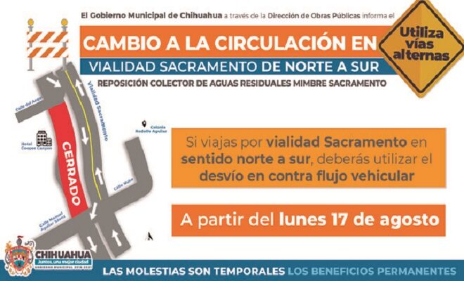 Luego de haber cumplido en tiempo y forma con los trabajos de reposición del colector de aguas residuales Mimbre – Sacramento en sentido sur – norte, que requirieron un cambio a la circulación vehicular sobre la vialidad Sacramento; a partir del lunes 17 de agosto habrá un nuevo cambio a la circulación, ahora en sentido norte – sur con lo que se finalizan los trabajos de la reposición del colector.