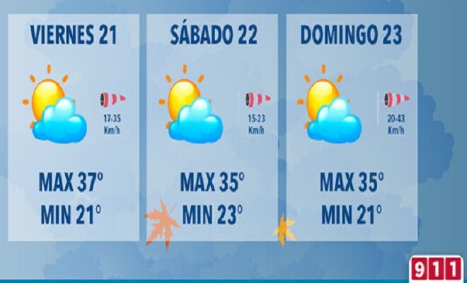 Este viernes se espera que la temperatura alcance los 37ºC como máximo y que descienda hasta los 21 grados centígrados por la noche, mientras que sábado y domingo el termómetro podría marcar hasta los 35 grados Celsius, así como 25 y 21ºC como mínimo respectivamente; además las ráfagas de viento para el domingo podrían alcanzar los 43 kilómetros por hora durante la noche.