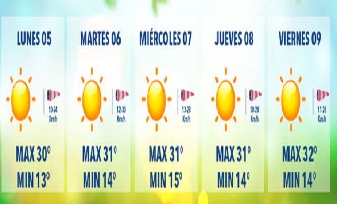 Según el pronóstico del Servicio Meteorológico Nacional, el lunes la temperatura máxima será de 30 grados y la mínima de 13; para los días martes, miércoles y jueves, las máximas se mantendrán en una constante de 31 grados Celsius y las mínimas en los 14°C; el viernes que será el día más caluroso, el termómetro subirá a los 32 y bajará a los 14 grados, respectivamente.
