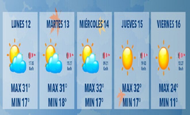 Para lunes y martes la temperatura máxima será de 31 grados para ambos días y la mínima de 17 y 18° C, respectivamente; para miércoles y jueves serán las mismas, con una máxima de 32 y una mínima de 17 grados; finalmente el viernes, aunque se espera un día soleado, habrá un descenso respectivo considerable de hasta 24 y 11 grados Celsius.