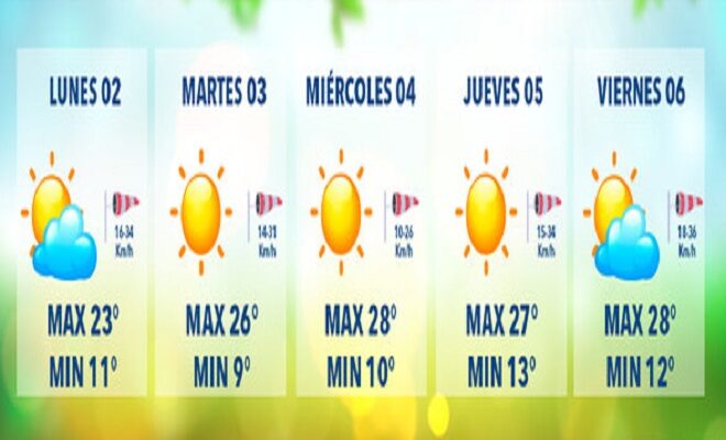 El lunes habrá nublados escasos con temperatura máxima de 23 grados y mínima de 11; para el martes se espera una máxima de 26 y mínima de 9°C; el miércoles el termómetro subirá a los 28 y descenderá a los 10 grados Celsius; el jueves se esperan 27 y 13 grados, respectivamente; y el viernes se pronostica un día con nublados intermitentes, con temperatura máxima de 28 y mínima de 12 grados centígrados.