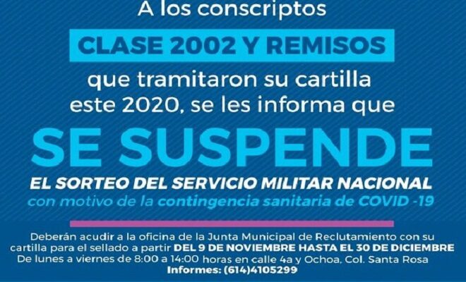 Ciudad de Chihuahua.- Debido a la actual contingencia por COVID19 y al semáforo rojo en la misma, se suspende el Sorteo del Servicio Militar Nacional Clase “2020” y Remisos, por instrucción del 23 Batallón de Infantería de la Secretaría de la Defensa Nacional (SEDENA), así lo dio a conocer la Secretaría del Ayuntamiento de Chihuahua.