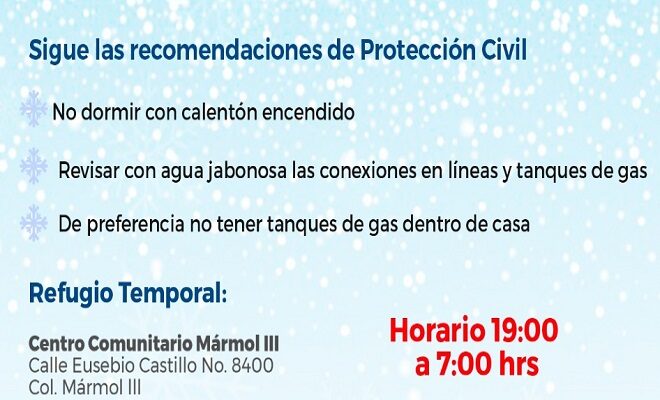 Ante ello, el refugio temporal de la colonia Mármol lll continúa abierto para ofrecer un lugar seguro a quienes no tengan donde pasar la noche o su vivienda no los proteja del temporal y se encuentra ubicado en calle Eusebio Castillo 8400, de la citada colonia en horario de 19:00 a 07:00 horas.