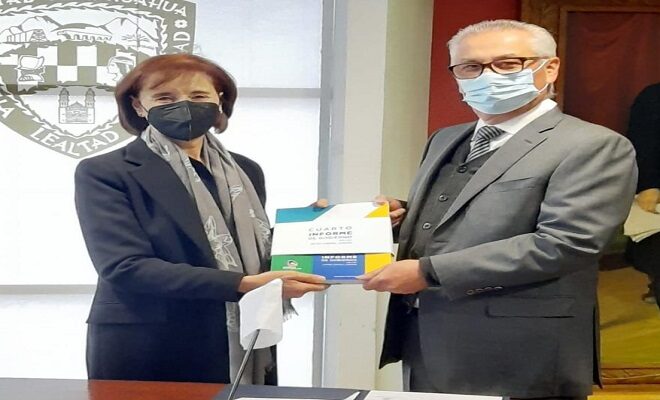 La diputada Blanca Gámez Gutiérrez en su calidad de Presidenta del Congreso del Estado de Chihuahua, recibió de manos del Secretario General de Gobierno, Luis Fernando Mesta Soulé el Cuarto Informe de Javier Corral Jurado, Gobernador Constitucional del Estado de Chihuahua.