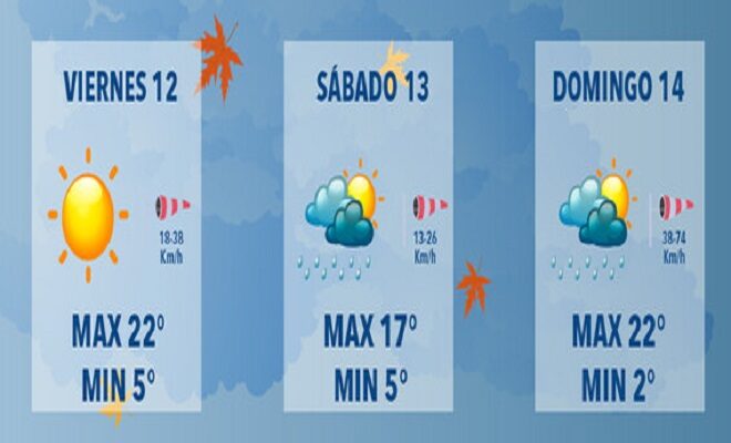 El viernes habrá cielo mayormente soleado, con temperatura máxima de 22 grados Celsius y mínima de 5; el sábado se pronostican lluvias con temperatura máxima de 17° C y 5 grados como mínima; en tanto el domingo también se esperan precipitaciones, temperaturas de 22 y 2 grados Celsius, respectivamente y vientos que podrían superar los 70 kilómetros por hora.