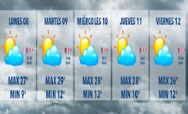 La temperatura máxima para hoy lunes será de 27 grados y la mínima de 9; para el martes, de 29 y 12 grados Celsius, respectivamente; para miércoles y jueves se esperan temperaturas máximas en ambos días de 28 grados y mínimas de 8 y 10, respectivamente; en tanto el viernes el termómetro llegará hasta los 26 grados y descenderá a los 12° C.