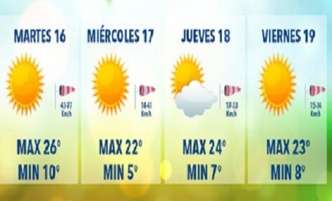 El miércoles los vientos disminuirán hasta 41 kilómetros por hora y las temperaturas serán de 22 y 5 grados Celsius, respectivamente; para jueves y viernes el termómetro ascenderá de manera respectiva hasta los 24 y 23 grados y descenderá a los 7 y 8° C.
