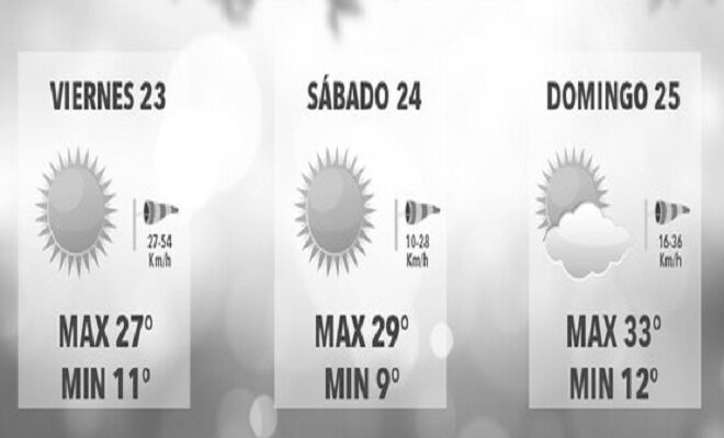Este viernes será el día menos caluroso, con temperaturas de 27 grados Celsius como máxima y 11°C en la mínima, además de vientos que podrían superar los 50 kilómetros por hora; el sábado la temperatura máxima será de 29 grados y la mínima de 9° C; en tanto el domingo se espera un incremento en el termómetro que podría llegar a los 33 grados y bajar a los 12 ° C, con posibilidad de nublados.