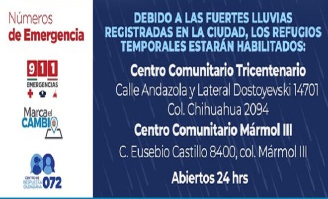 | Ciudad de Chihuahua.- Debido a las fuertes lluvias registradas en la ciudad, el Gobierno Municipal habilitó dos refugios temporales uno ubicado al norte de la ciudad, en el centro comunitario Tricentenario y el otro al sur de la ciudad, en el centro comunitario Mármol III, los cuales estarán abiertos las 24 horas. En el refugio temporal Tricentenario, ubicado calle Andazola y lateral Dostoyevsky #14701, colonia Chihuahua 2094, se estará recibiendo a las personas que se encuentran en situación de calle. Mientras que el refugio temporal Mármol III, ubicado en la calle Eusebio Castillo #8400 de la colonia Mármol III, recibirá a las familias afectadas por las lluvias en sus hogares. Cabe señalar que elementos de Bomberos, Policía Municipal y Protección Civil han brindando auxilio y apoyo a la ciudadanía que se ha visto afectada por las fuertes lluvias; asimismo, agentes de Grupos Especiales realizan recorridos en las zonas afectadas para ayudar a quién lo necesite. Por lo cual se pide a la población que atienda las recomendaciones y tome las debidas precauciones para evitar inundaciones en los hogares o accidentes en la vía pública. Ante cualquier situación de emergencia, pueden comunicarse al teléfono 9-1-1, así como en la aplicación “Marca el Cambio” y en los botones de pánico, que se encuentra ubicados en diversos puntos de la ciudad. Debido a las lluvias que podrán presentarse en la ciudad, sigue las siguientes recomendaciones: Si conduces: – Maneja a velocidad moderada y con las luces encendidas. – Sé cortés y cede el paso a otros automovilistas y vehículos de emergencia. – Evita transitar por calles inundadas o corrientes de arroyos; detente y espera a que baje el nivel, es lo más seguro. Si te encuentras en la vía pública: – Permanece en un lugar seguro mientras concluye la lluvia. – No salgas si no es necesario, mientras llueve o hay pronóstico de lluvia fuerte. – Evita cruzar arroyos o corrientes fuertes. -No realices días de campo o recreo en cercanías de arroyos o cuerpos de agua. Si estás en casa – No dejes objetos que puedan volarse, en los techos, balcones o terrazas. – Evita sacar bolsas de basura u objetos que puedan obstruir desagües. – Revisa que las salidas de agua de patios o techos estén despejadas. El Gobierno Municipal continuará brindando atención a población que lo necesite durante esta temporada de lluvias, en Chihuahua juntos nos cuidamos y protegemos. |