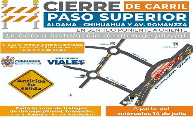 Ciudad de Chihuahua.- Da a conocer el Municipio que a partir de mañana miércoles 14 de julio se cerrará un carril al tránsito vehicular sobre la carretera Aldama-Chihuahua en sentido poniente a oriente, esto como parte de los trabajos del Paso Superior carretera Aldama-Chihuahua.