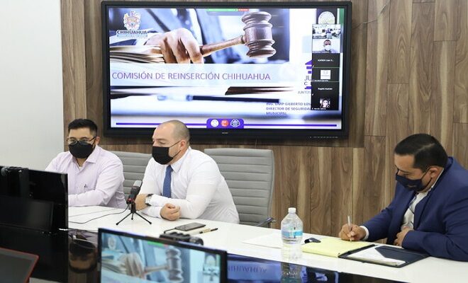 Ciudad de Chihuahua.- Con el objetivo de implementar acuerdos y desarrollar políticas que ayuden a la reinserción social de niñas, niños y adolescentes en conflicto con la ley, la Dirección de Seguridad Pública Municipal y la Comisión de Reinserción de la Mesa de Seguridad y Justicia del Fideicomiso para la Competitividad y Seguridad Ciudadana (FICOSEC), realizaron su sesión mensual en las instalaciones de la Comandancia Norte donde expusieron el trabajo y los resultados que se han logrado con Justicia Cívica en el municipio.