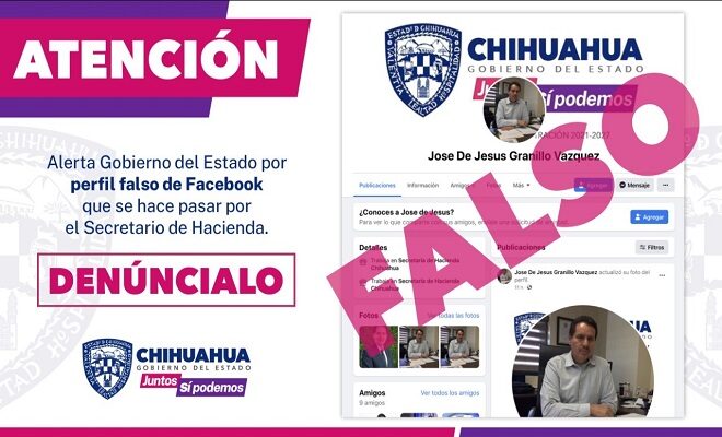 Chihuahua.- El Gobierno del Estado, alerta a la ciudadanía en general, así como a los miembros de los Ayuntamientos del Estado a no dejarse engañar por un perfil falso en la red social Facebook que se hace pasar por el Secretario de Hacienda, José de Jesús Granillo.