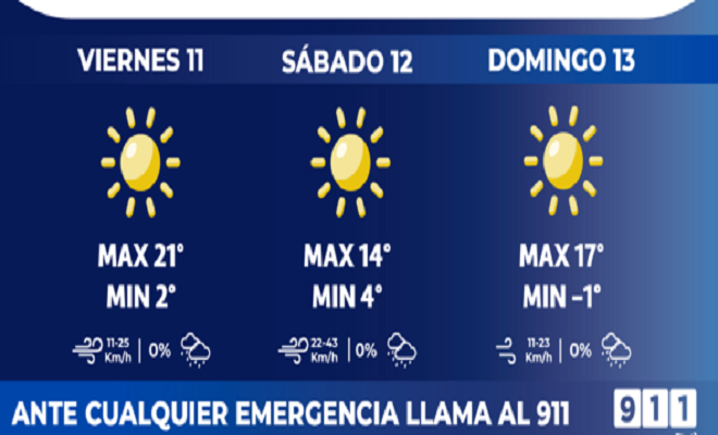 La temperatura máxima será de 21°C para este viernes, siendo éste el día más caluroso; el sábado la máxima esperada será de 14°C y la mínima de 4°C, y finalmente, el domingo el termómetro llegará a los 17°C y se pronostica un descenso a -1°C, respectivamente.