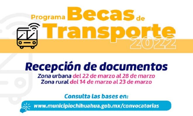 Ciudad de Chihuahua.- La Dirección de Desarrollo Humano y Educación del Municipio, iniciará este martes 22 de marzo la recepción de solicitudes y documentos de los estudiantes de la ciudad que deseen obtener el beneficio económico de las Becas de Transporte.