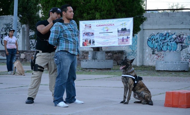 Como parte de las acciones para promover la prevención del delito, el grupo K-9 de la Dirección de Seguridad Pública Municipal (DSPM), realizó una exhibición sobre sus actividades ante cientos de personas que participan en las actividades que se realizan en el espacio público Campesina, en donde trabaja Paz y Convivencia Ciudadana A.C., con el respaldo de la Fundación del Empresariado Chihuahuense (FECHAC).