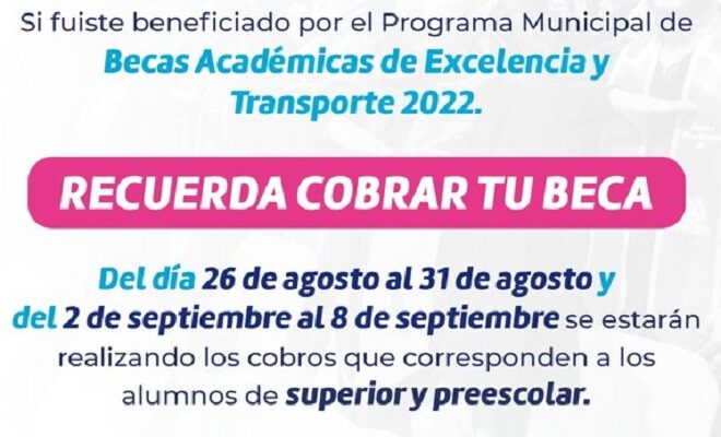 Cabe mencionar que, por cuestiones administrativas de la institución bancaria, el día 01 de septiembre no se podrá hacer el cobro de las becas.