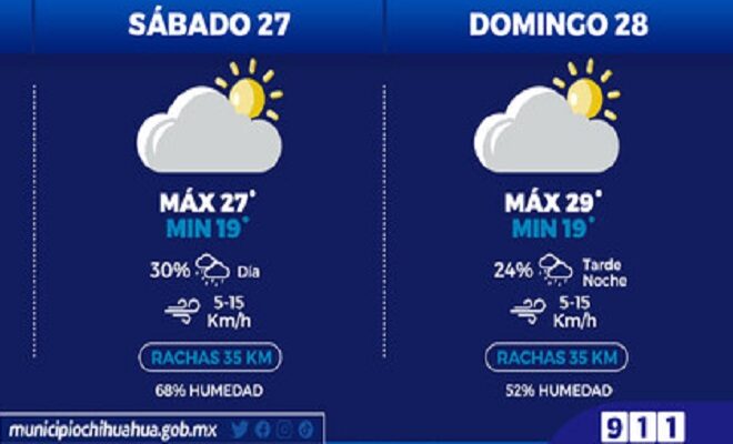 Por otro lado, este domingo la máxima será de 28°C y la mínima de 19°C, con vientos de hasta 35 kilómetros por hora, un 62 por ciento probabilidad de lluvias aisladas durante la tarde y un cielo nublado acompañado de tormentas eléctricas.