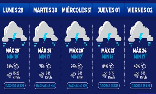 Asimismo, para el martes, se espera una máxima de 25°C y mínima de 17°C con vientos de hasta 45 kilómetros por hora, un cielo parcialmente nublado y una probabilidad de lluvia del 71 por ciento por la noche se prevén tormentas eléctricas.