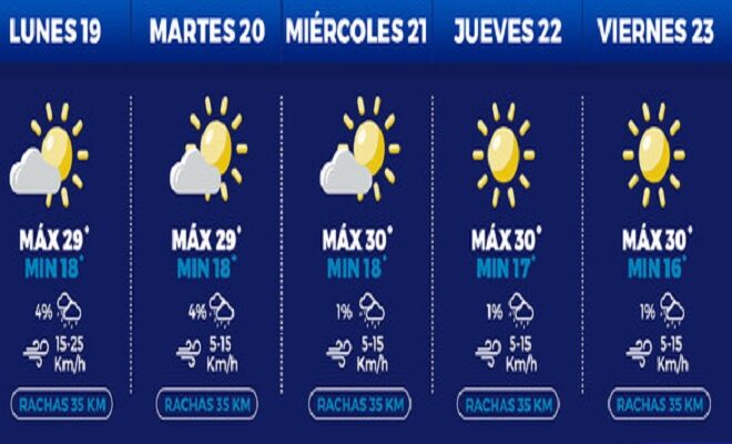 Finalmente, la máxima pronosticada para el viernes es de 30°C y la mínima de 16°C, con rachas de hasta 35 kilómetros por hora y con un cielo soleado.