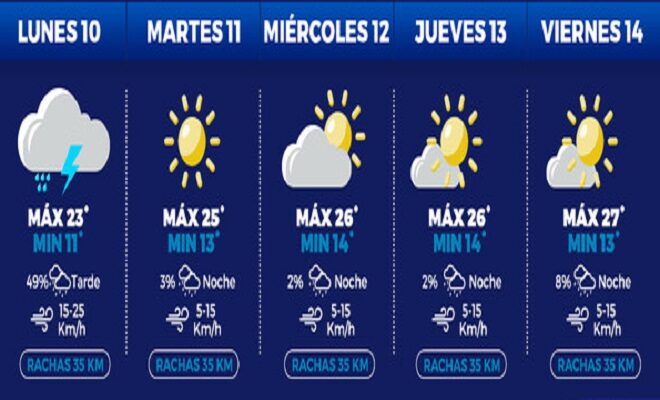 Por otro lado, para el miércoles se prevé una máxima de 26°C y una mínima de 14°C, con cielo soleado; para el jueves, se espera una máxima de 26°C y una mínima de 14°C, también se prevé con cielo de mayormente soleado y vientos de hasta 35 kilómetros por hora.