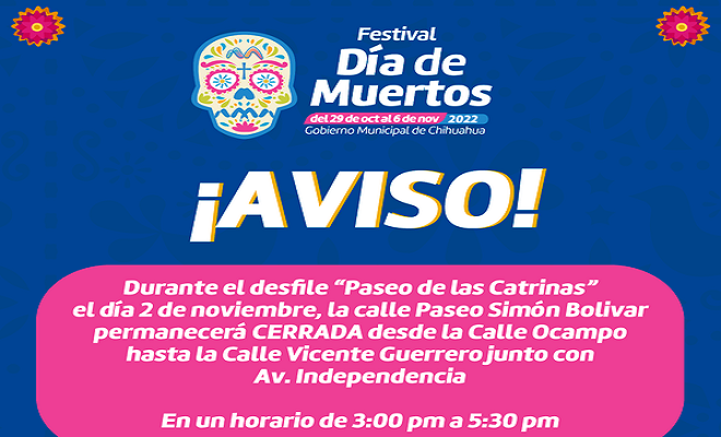 Ciudad de Chihuahua.- El próximo miércoles 2 de noviembre de 15:00 a 17:30 horas, el Paseo Bolívar, desde la avenida Ocampo y hasta la calle Vicente Guerrero, permanecerá cerrado para dar paso a los contingentes que formarán parte del “Paseo de las Catrinas”, organizado por el Gobierno Municipal, a través del Instituto de Cultura del Municipio con motivo de la celebración de Día de Muertos, por lo que se solicita la ciudadanía extremar precauciones y recurrir a rutas alternas.
