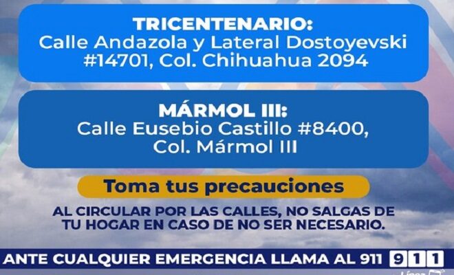A partir de este miércoles 02 de noviembre de 07:00 pm a 07:00 am, la ciudadanía que así lo requiera, puede acercarse al Refugio Temporal Tricentenario que se ubica en la calle Andazola y lateral Dostoyevsky número 1470, en la colonia Chihuahua 2094, y al Marmol III, ubicado en la calle Eusebio Castillo, número 8400 en la colonia Mármol III.