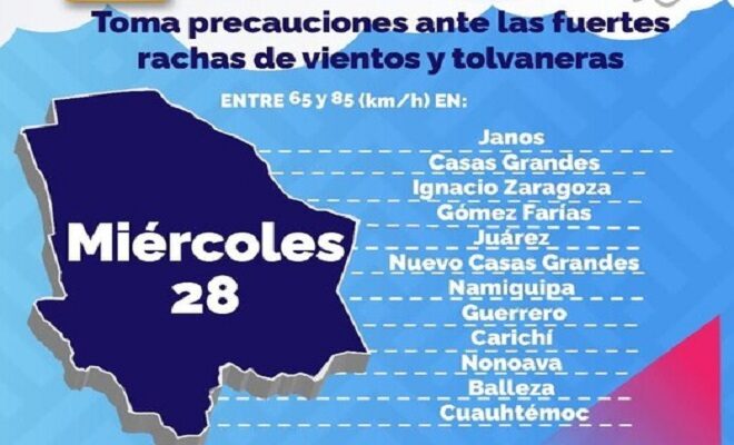 | La Coordinación Estatal de Protección Civil, dio a conocer que, para esta semana se prevé el ingreso de dos frentes fríos a la entidad, los cuales generarán fuertes rachas de viento en diversas zonas del estado. Mientras para este martes 27, el ingreso del frente frío número 20 al estado, propiciará un ambiente de gélido a muy frío por la mañana, con rachas de viento que pueden superar los 55 y 65 kilómetros por hora (km/h) en Janos, Casas Grandes Madera, Ignacio Zaragoza, Cusihuiriachí y Majalca. De igual forma, para este miércoles 28 de diciembre la masa de aire frío que impulsa al frente frío número 20 y el ingreso de otro un nuevo frente frío, ocasionarán la presencia de rachas que pueden superar los 65 y 85 km/h en Janos, Casas Grandes, Ignacio Zaragoza y Gómez Farías, Juárez, Nuevo Casas Grandes, Namiquipa, Guerrero, Carichí, Nonoava, Balleza, Cuauhtémoc, Majalca, Ahumada, Ocampo, Bocoyna, Guachochi, Chihuahua, Camargo y Manuel Benavides. En tanto, las temperaturas mínimas registradas en las últimas 24 horas en el territorio, indicaron que El Vergel en el municipio de Balleza presentó la temperatura más baja, con -11 grados centígrados (°C), seguido por Majalca -9.3 °C, Temósachic -8.7, Urique -6.5, Guachochi -7.7 y Madera -5.4. Las temperaturas esperadas para este día son (°C máx/min): Chihuahua 23/-2, Juárez 16/-2, Janos 21/-3, Madera 16/-5, Temósachic 17/-6, Cuauhtémoc 19/-3, Ojinaga 19/-1, Delicias 21/-2, Camargo 21/-2, Jiménez 20/-3, Parral 20/-2, Creel 15/-6, Chínipas 28/9, Guachochi 16/-5, El Vergel 15/-6. Para el resto del estado se prevén vientos entre 45 y 55 km/h, por lo que la CEPC advierte que las fuertes ráfagas de viento pueden ocasionar tolvaneras en los tramos carreteros de Chihuahua a Juárez, de Juárez a Ascensión, de Janos a Buenaventura y de Chihuahua a La Junta. Además, el pronóstico, indica la probabilidad de lluvias de dispersas a moderadas de 5.1 a 25 milímetros (mm) en Madera, Temósachic, Morís, Ocampo y Uruachí, así como lluvias de aisladas a dispersas en Janos, Ignacio Zaragoza, Gómez Farías, Matachí, Maguarichi, Bocoyna, Chínipas y Guazapares. Estas precipitaciones pueden estar acompañadas de caída de granizo y actividad eléctrica, así como de posible caída de agua nieve en las partes altas de la región serrana. Las temperaturas esperadas para el miércoles 28, son (°C máx/min): Chihuahua 23/6, Juárez 17/2, Janos 16/1, Madera 12/-1, Temósachic 14/-3, Cuauhtémoc 14/1, Ojinaga 24/2, Delicias 25/3, Camargo 25/1, Jiménez 24/-1, Parral 22/3, Creel 11/-4, Chínipas 26/8, Guachochi 12/-4 y El Vergel 12/-5. |