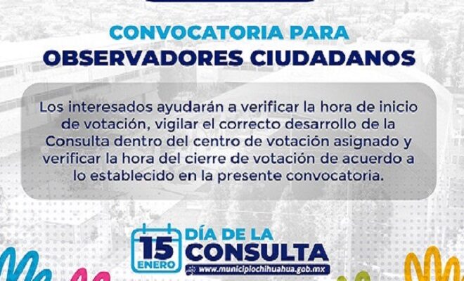 Ciudad de Chihuahua.- Con la finalidad de promover la cultura cívica y la democracia en Chihuahua Capital, la Dirección de Desarrollo Humano y Educación, invita a los ciudadanos a participar como observadores en la consulta ciudadana del Presupuesto Participativo 2023 que se llevará a cabo el próximo 15 de enero.