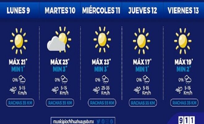 | – Exhortan a continuar cuidándose para evitar afecciones a la salud. Ciudad de Chihuahua.- La Coordinación Municipal de Protección Civil, informa que, para la semana del 9 al 13 de enero, se esperan días soleados con mañanas y noches frías, por lo que se exhorta a no bajar la guardia ante el descenso temperatura y seguir las recomendaciones para cuidar la salud y evitar enfermedades respiratorias. De acuerdo al pronóstico que emite el Servicio Meteorológico Nacional de CONAGUA, para este lunes se espera una temperatura máxima de 21°C y una mínima de 1°C con vientos de hasta 35 kilómetros por hora con un cielo soleado; para el martes esperamos una máxima de 23°C y mínima de 3°C con vientos de hasta 35 kilómetros por hora, con un cielo soleado. Por otro lado, para el miércoles la máxima será de 23°C y la mínima de 3°C y vientos de hasta 35 kilómetros por hora con cielo soleado; mientras que para el jueves se espera una máxima de 17°C y una mínima de 1°C y vientos de hasta 35 kilómetros por hora con cielo mayormente soleado sin probabilidad de lluvia para ambos días. Finalmente, la máxima pronosticada para el viernes es de 19°C y la mínima de 2°C con rachas de hasta 35 kilómetros por hora con un cielo soleado sin probabilidad de lluvia. Ante cualquier emergencia, comunícate de inmediato a la línea 9-1-1 o utiliza la aplicación Marca el Cambio. Recomendaciones por frío: • No exponerse a corrientes de aire. • Abrigarse bien al salir de casa. • No permanecer en el exterior por periodos prolongados de tiempo. • Reportar al 9-1-1 la presencia de personas en situación de calle, durante la noche. • Revisar correctamente calentones e instalaciones de gas. • Por ningún motivo dejar calefactores encendidos durante la noche. • Evitar la existencia de tanques de gas dentro de la casa. • Ventilar adecuadamente la vivienda. |
