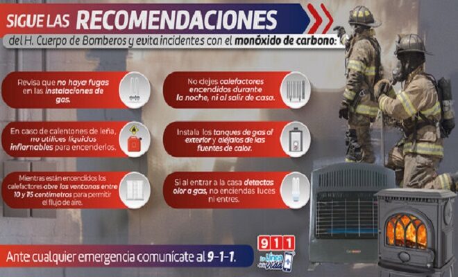 Ciudad de Chihuahua.- A causa de las bajas temperaturas que aún se siguen presentando en la ciudad, y con ello el uso de calefactores, el Heroico Cuerpo de Bomberos, exhorta a la población a seguir recomendaciones preventivas para evitar accidentes, derivados del uso de estos aparatos que producen monóxido de carbono, gas responsable de una cantidad importante de intoxicaciones cada año.