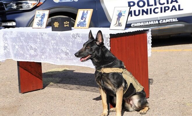 Chihuahua.- Jack, perro Policía Municipal que sirvió y protegió a la comunidad chihuahuenses durante tres años, fue despedido con honores, tras recibir un cálido y merecido homenaje que le realizaron sus mismos compañeros humanos, luego de su fallecimiento días atrás y cuya labor en vida derivó en importantes intervenciones policiales.