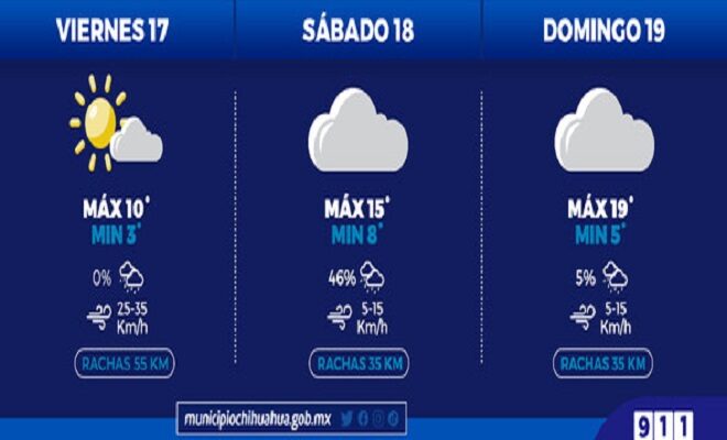 Para este viernes la temperatura máxima pronosticada será de 10°C con vientos de 25 a 35 kilómetros por hora y rachas de hasta 55 kilómetros por hora, mientras que para mañana sábado 18 de febrero la mínima será de 8°C con máxima de 15°C, viento de 5 a 15 kilómetros por hora con rachas de 35 kilómetros por hora y un 46 por ciento de probabilidad de precipitaciones, que en algunas zonas del municipio de Chihuahua podría presentarse en forma de agua nieve.